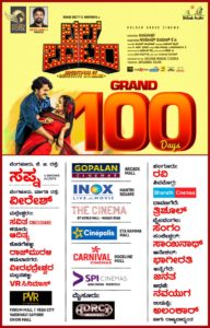 ಬೆಂಗಳೂರು,ಮೈಸೂರು,ದಾವಣಗೆರೆ ಸೇರಿದಂತೆ ಕರ್ನಾಟದದ್ಯಾಂತ ಸುಮಾರು 20ಕ್ಕೂ ಹೆಚ್ಚು ಚಿತ್ರಮಂದಿರಗಳಲ್ಲಿ ಇದು ನೂರು ದಿನಗಳ ಪ್ರದರ್ಶನ ಕಂಡಿದೆ. 15ನೇ ವಾರದಲ್ಲೂ ಚಿತ್ರ ಬೆಂಗಳೂರಿನಲ್ಲಿ 15ಕ್ಕೂ ಹೆಚ್ಚು ಶೋಗಳಲ್ಲಿ ಪ್ರದರ್ಶನಗೊಳ್ಳುತ್ತಿದೆ.