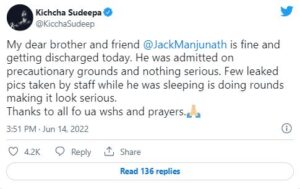 ಜಾಕ್ ಮಂಜು ಅವರ ಆರೋಗ್ಯದ ಕುರಿತು ಟ್ವೀಟ್ ಮಾಡಿರುವ ಕಿಚ್ಚ ಸುದೀಪ್, “ನನ್ನ ಸಹೋದರ ಮತ್ತು ಗೆಳೆಯ ಜಾಕ್ ಮಂಜು ಆರೋಗ್ಯವಾಗಿದ್ದಾರೆ. ಇಂದು ಆಸ್ಪತ್ರೆಯಿಂದ ಅವರು ಡಿಸ್ ಚಾರ್ಜ್ ಆಗುತ್ತಿದ್ದಾರೆ. ಮುನ್ನೆಚ್ಚರಿಕೆಗಾಗಿ ಅವರನ್ನು ಆಸ್ಪತ್ರೆಗೆ ದಾಖಲಿಸಲಾಗಿತ್ತು. ಆರೋಗ್ಯದಲ್ಲಿ ಗಂಭೀರ ಸಮಸ್ಯೆ ಏನೂ ಇಲ್ಲ. ಅವರು ಆಸ್ಪತ್ರೆಯ ಬೆಡ್ ಮೇಲೆ ಮಲಗಿದ್ದ ಫೋಟೋಗಳು ಎಲ್ಲರನ್ನೂ ಆತಂಕ್ಕೀಡು ಮಾಡಿದ್ದವು. ಅವರು ಆರೋಗ್ಯವಾಗಿದ್ದಾರೆ. ನಿಮ್ಮೆಲ್ಲರ ಹಾರೈಕೆಗಳಿಗೆ ಧನ್ಯವಾದಗಳು’ ಎಂದು ಬರೆದುಕೊಂಡಿದ್ದಾರೆ.
