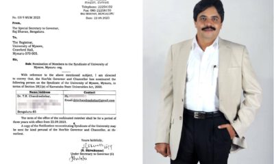 ಚಮಕ್, ಅಯೋಗ್ಯ, ಬೀರ್ ಬಲ್, ಬುದ್ದಿವಂತ 2 ಸೇರಿದಂತೆ ಅನೇಕ ಯಶಸ್ವೀ ಚಿತ್ರಗಳ ನಿರ್ಮಾಪಕರಾದ ಕ್ರಿಸ್ಟಲ್ ಪಾರ್ಕ್ ಸಿನಿಮಾಸ್ ನ ಡಾ|| ಟಿ.ಆರ್. ಚಂದ್ರಶೇಖರ್ ಅವರನ್ನು ಮೈಸೂರು ವಿಶ್ವವಿದ್ಯಾನಿಲಯದ ಸಿಂಡಿಕೇಟ್ ಸದಸ್ಯರನಾಗಿ ಕರ್ನಾಟಕ ರಾಜ್ಯದ ಘನತೆವೆತ್ತ...